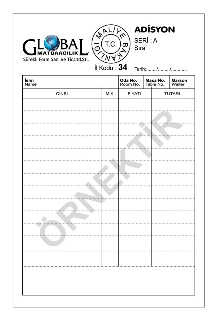 Adisyonlar, cafe ve restoranlarda sıkça kullanılan bir üründür ve siparişleri not etmek, hesapları tutmak için kullanılır. Adisyonlar, 1 asıl ve 1 kopya olarak üretilir ve üst kısmında perfore delikleri bulunur, böylece bir nüshasını müşteriye verirken diğer nüshayı da kasada saklama imkanı sağlar.